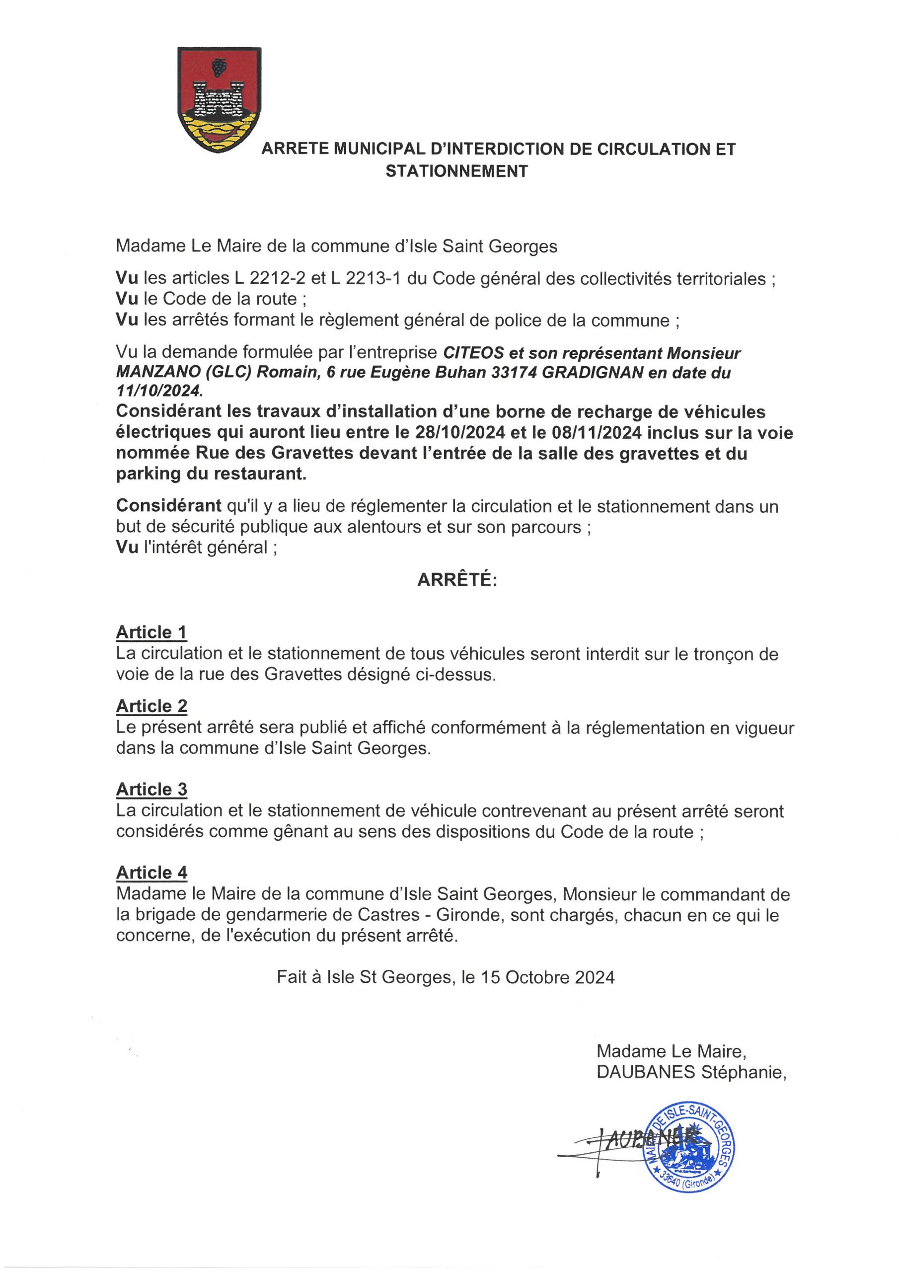 Arrêté Tvx Borne de recharge